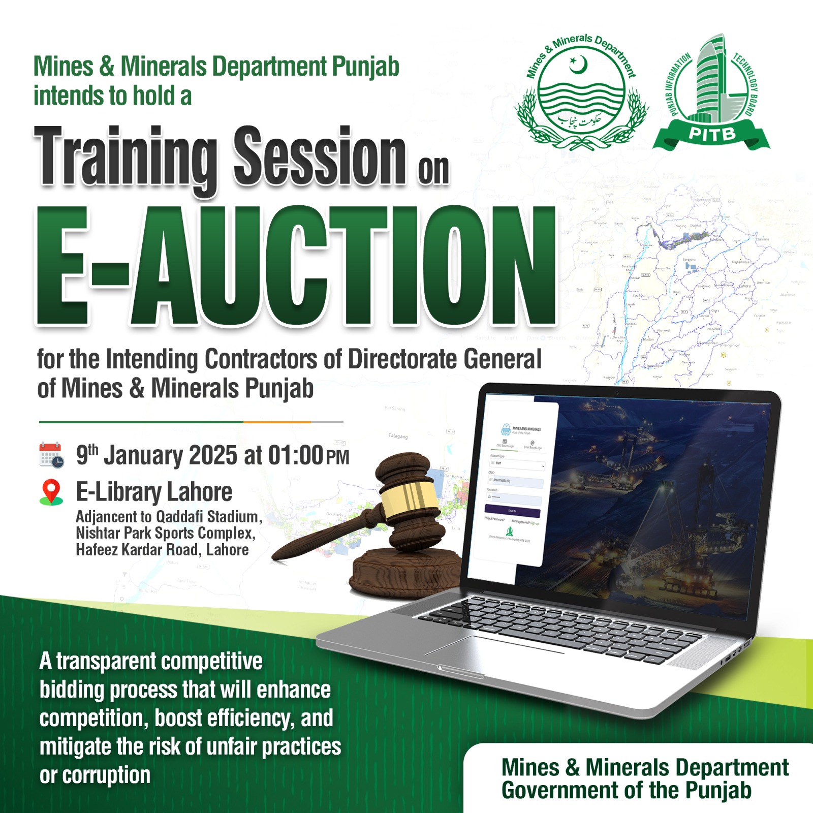 - E-Auction Training Session on 1pm, Jan 09, 2025, at E-Library Lahore, Adjacent to Qaddafi Stadium, Nistar Park Sports Complex, Hafeez Kardar Road, Lahore.